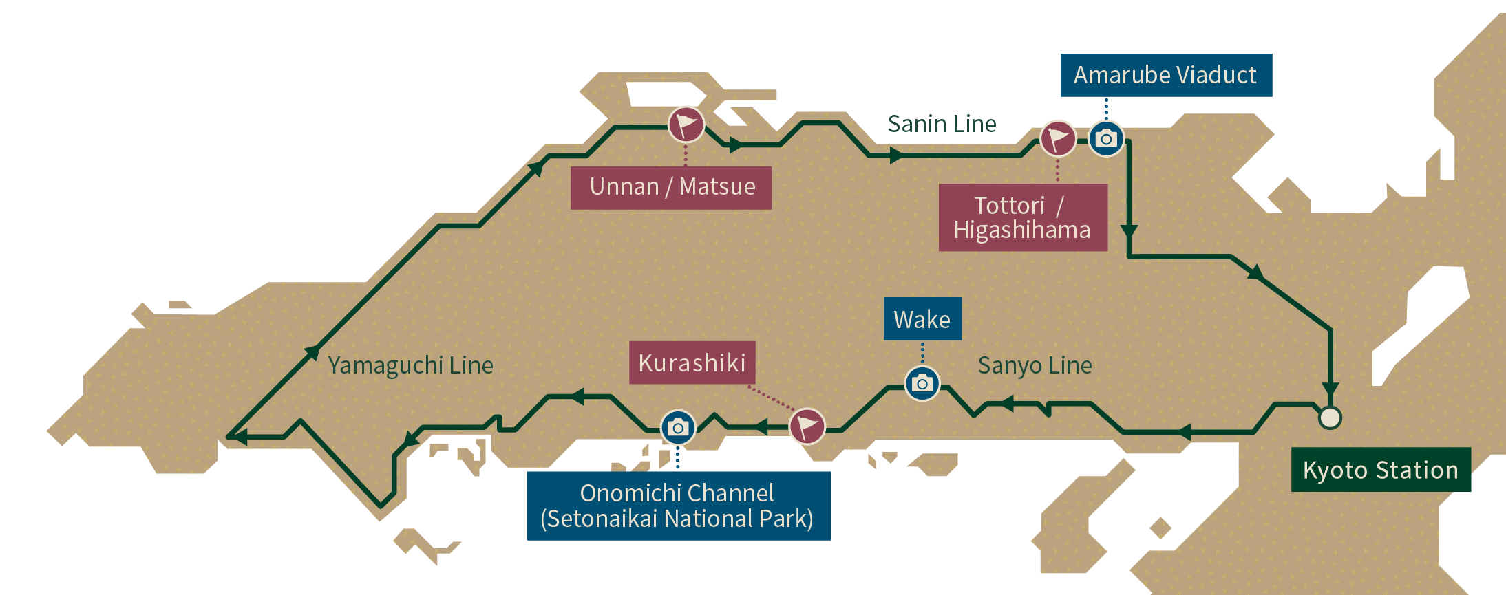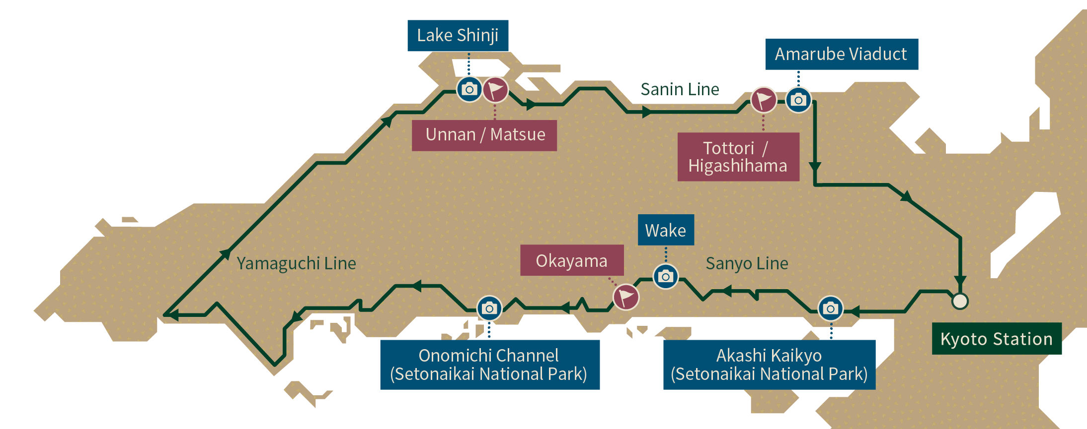 *On the Sanin Course (Shimonoseki-bound), the Sanyo Course (Shimonoseki-bound), and the Lake Biwa Loop / Setouchi Course (Shimonoseki-bound), guests transfer from the destination Shimonoseki Station to Kokura Station by the MIZUKAZE bus. (Bus company: Chugoku JR Bus)